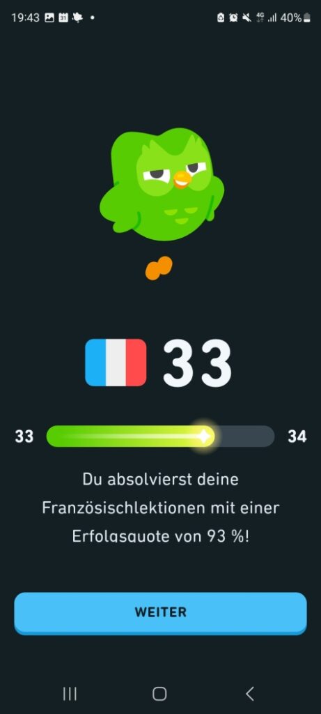 - Ich habe im Oktober beschlossen, mein Französisch aufzufrischen. Mein Duolingo-Streak seitdem: 85 Tage in Folge, mein aktueller Duolingo-Score Ende Dezember: 33.