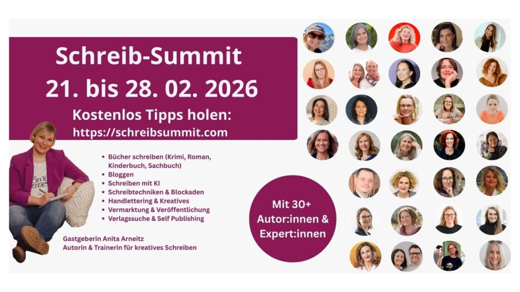 - Vom 21. bis 28. Februar 2026 gibt es einen Online-Schreibsummit mit über 30 Expert:innen aus den Bereichen kreatives Schreiben, Romanhandwerk, Self-Publishing, Storytelling und Buchmarketing. Und ich bin als Speakerin dabei. 😊 Ich freue mich, dass Gastgeberin Anita Reitz mich eingeladen hat. Interessiert? Die Anmeldung ist ab sofort möglich und die Teilnahme ist kostenlos.